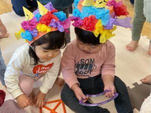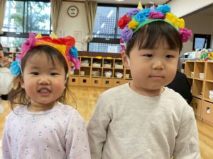 当日は少しドキドキする様子もありましたが”おに”や”豆まき”以外にも節分の日に食べるものや意味などを知ったり、新聞紙で作った豆をオニのお面をつけた保育者にえいっ!と投げたりして楽しみました。集い終了後も作った帽子が気に入り被ったまま遊んでいる子どももいました。
