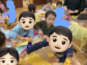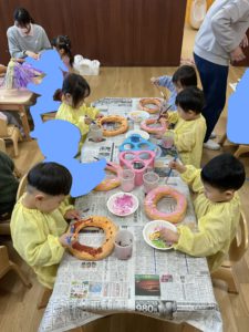 「これ!僕のドーナツ!私のジュース美味しそう!!」とドーナツ、服、ジュース、はたきをみんなで作り、楽しそうな子どもたちです🍩👕🍹🧹