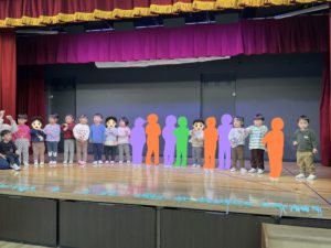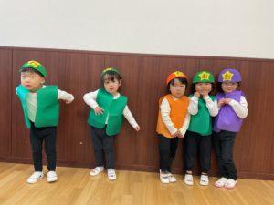 素敵な帽子と服を着て、舞台の上で可愛いダンスや保育士との言葉の掛け合いを披露し、おたすけ任務を完了した、24人のおたすけこびとさん✨