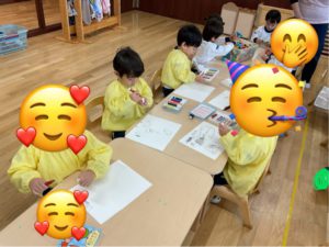 自分のマーカーペンを使ってキャップの開け閉めにも挑戦し、好きな絵を描いています!描けると、「先生みて!」っと見せてくれる子ども達の笑顔がとても可愛いです♡