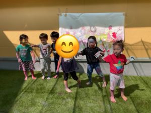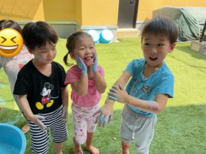 汚れてもいい服で手や足、体全体に絵の具を自分で塗り、絵の具の感触を楽しみました🎨
