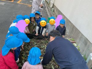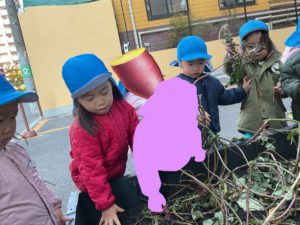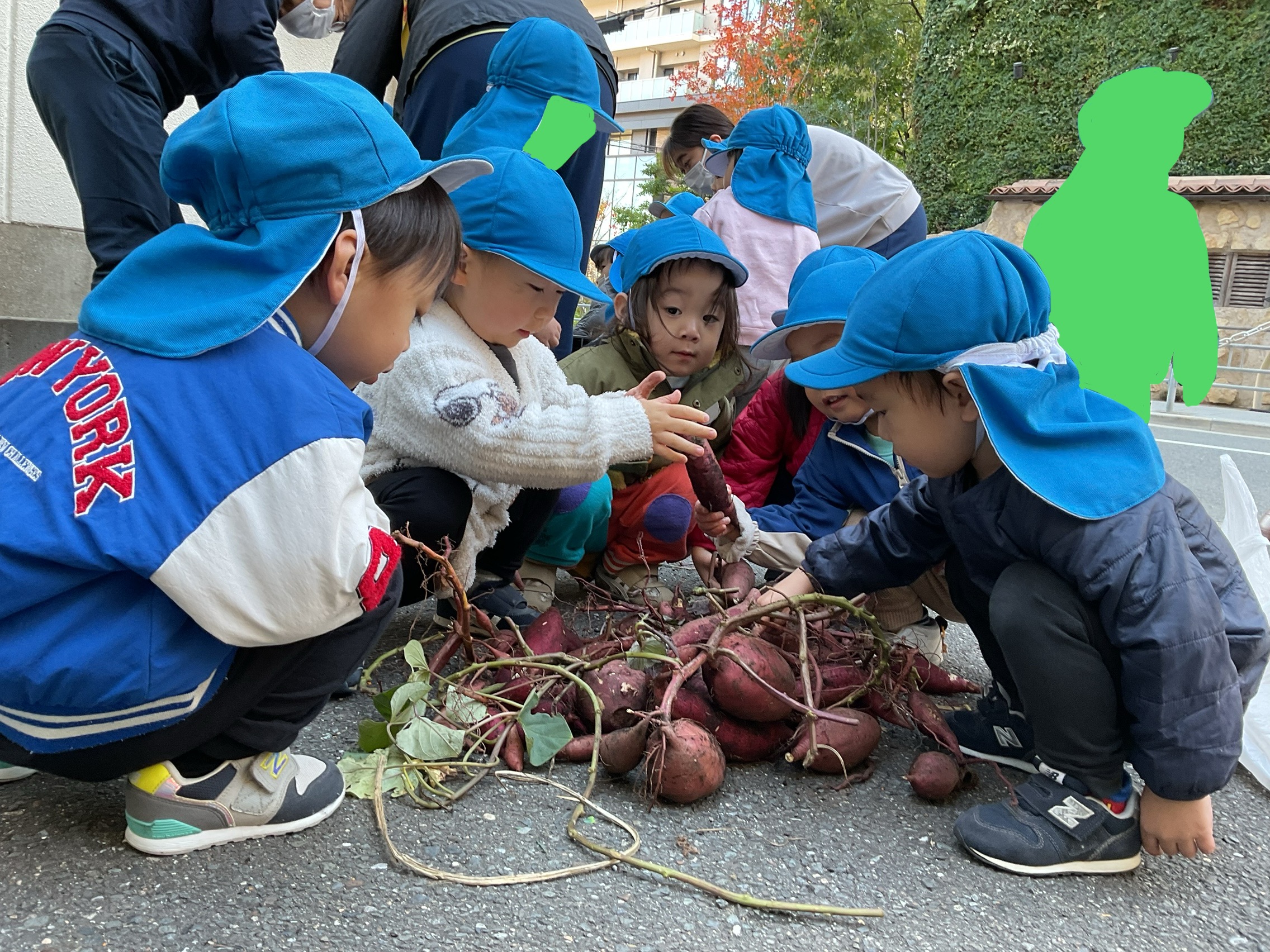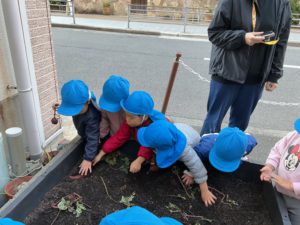 こども園横の駐車場のプランターで育ったさつまいもを子どもたちと一緒に掘りに行きました!