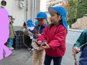 昼夜の寒暖の差もだんだんと大きくなり、少しずつ冬の訪れを感じる頃となりました。ますます秋も深まり近くの公園で秋を感じながら、自然との触れ合いを楽しんでいる子どもたち。