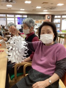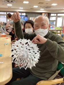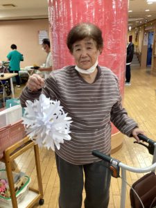 こちらの作品は「雪の結晶❄️」です私も詳しい作り方は組織秘密という事で教えていただけませんでしたが、担当職員と利用者様が黙々と作業を進めておられ「うわーできたー!」と声をあげられたので見に行くととっても素敵な作品が完成しており思わず「うわ、すっご」と言ってしまったのを覚えております😂