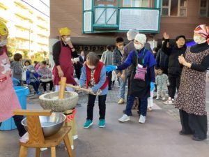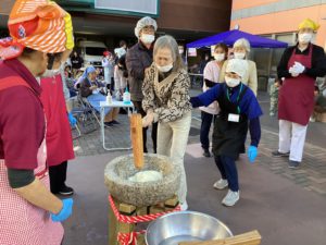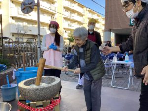 杵は少し重たいので職員が後ろからついておりますが皆様しっかりとご自身の力で餅を「よいしょ〜」「よいしょ〜」とついてくださりました!