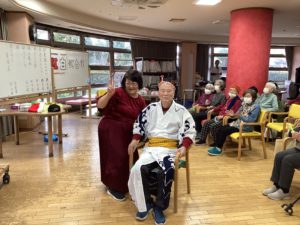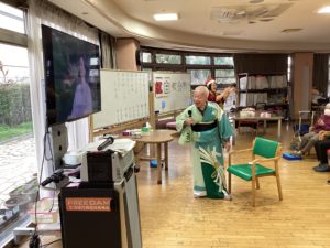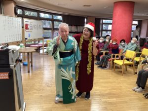 普段から稲田デイサービスでは歌うまの利用者様が多く普段から熱唱していただいております、そんな利用者様に浴衣や着物、サンタさんの格好などをしていただき全員の前に入場していただき熱唱していただいた後、挨拶をしていただいたり、インタビューを受けていただいております!