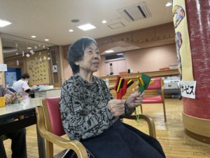 アーバンケア稲田にはピアノが得意な職員がおりまして、職員が奏でるピアノのリズムに合わせたり、カラオケの曲のリズムに合わせて、利用者様に鳴子を振っていただいたり、鈴を鳴らしていただいたりしております。音楽はやっぱりどの世代でも盛り上がりますね〜✌🏻