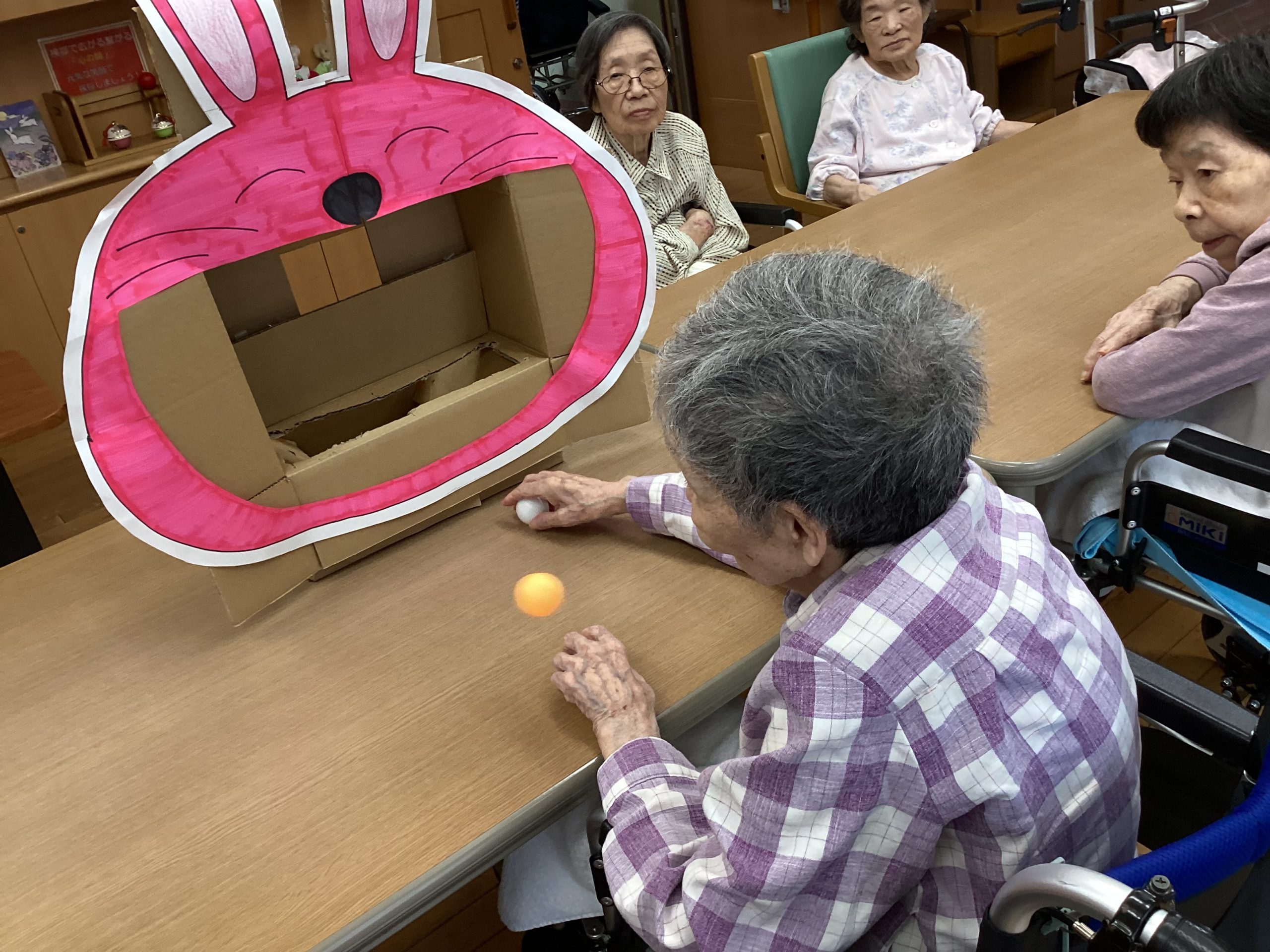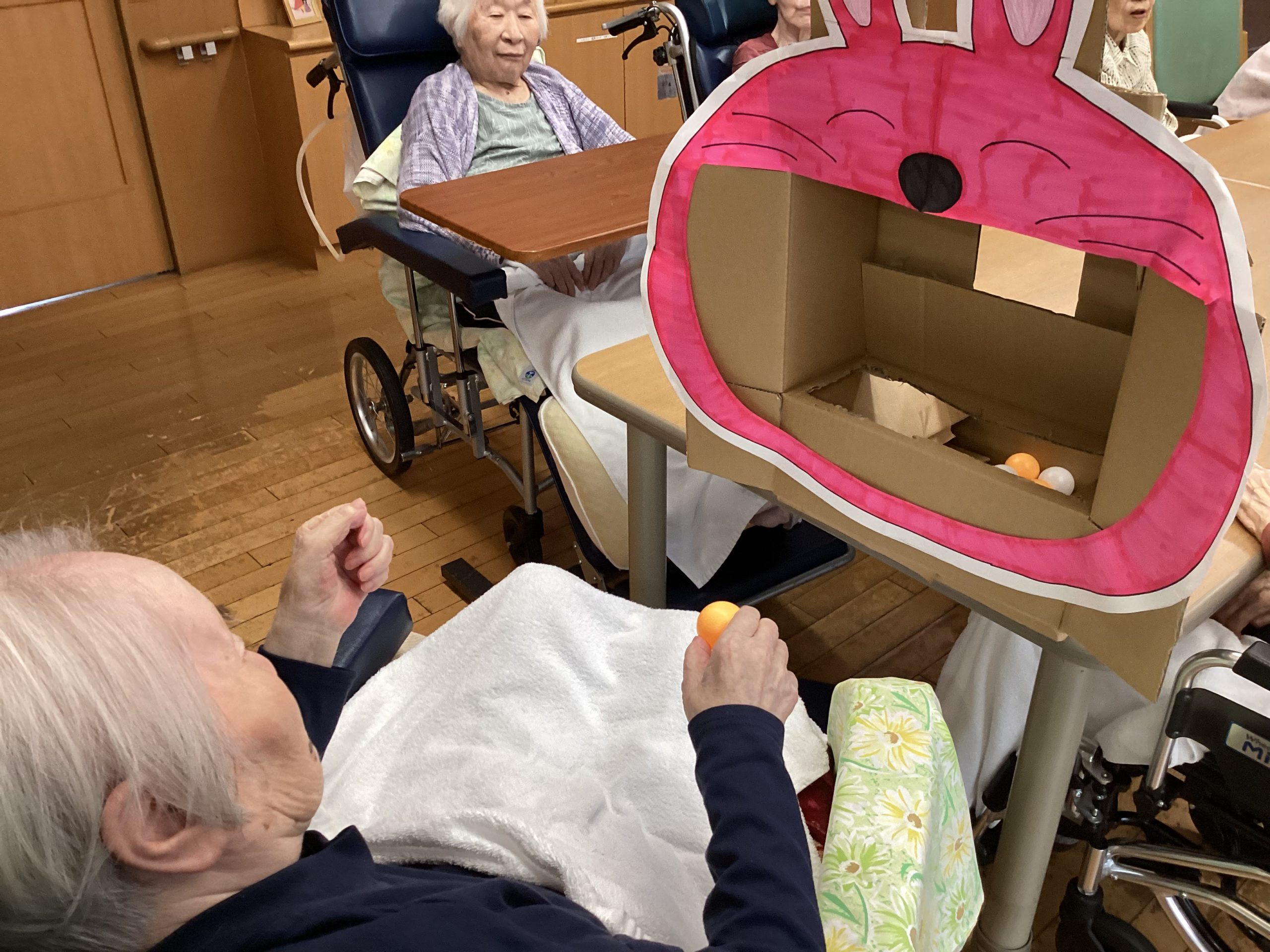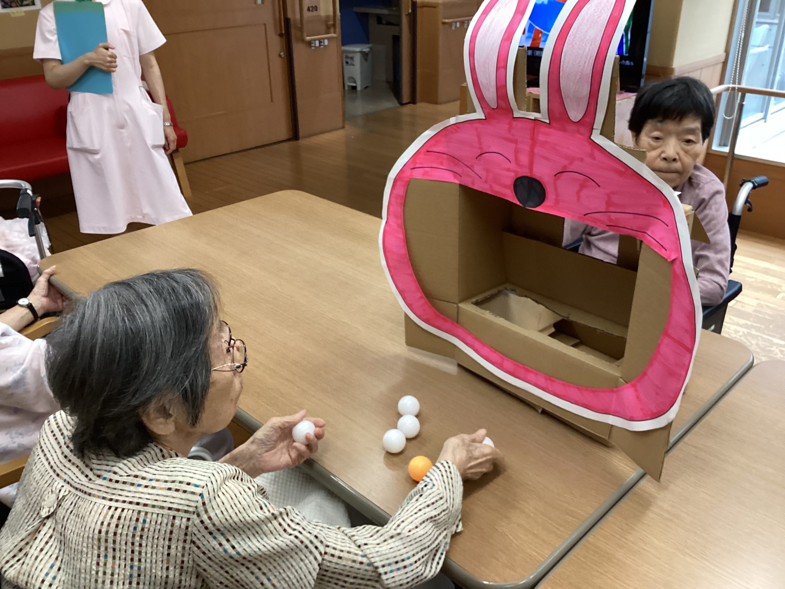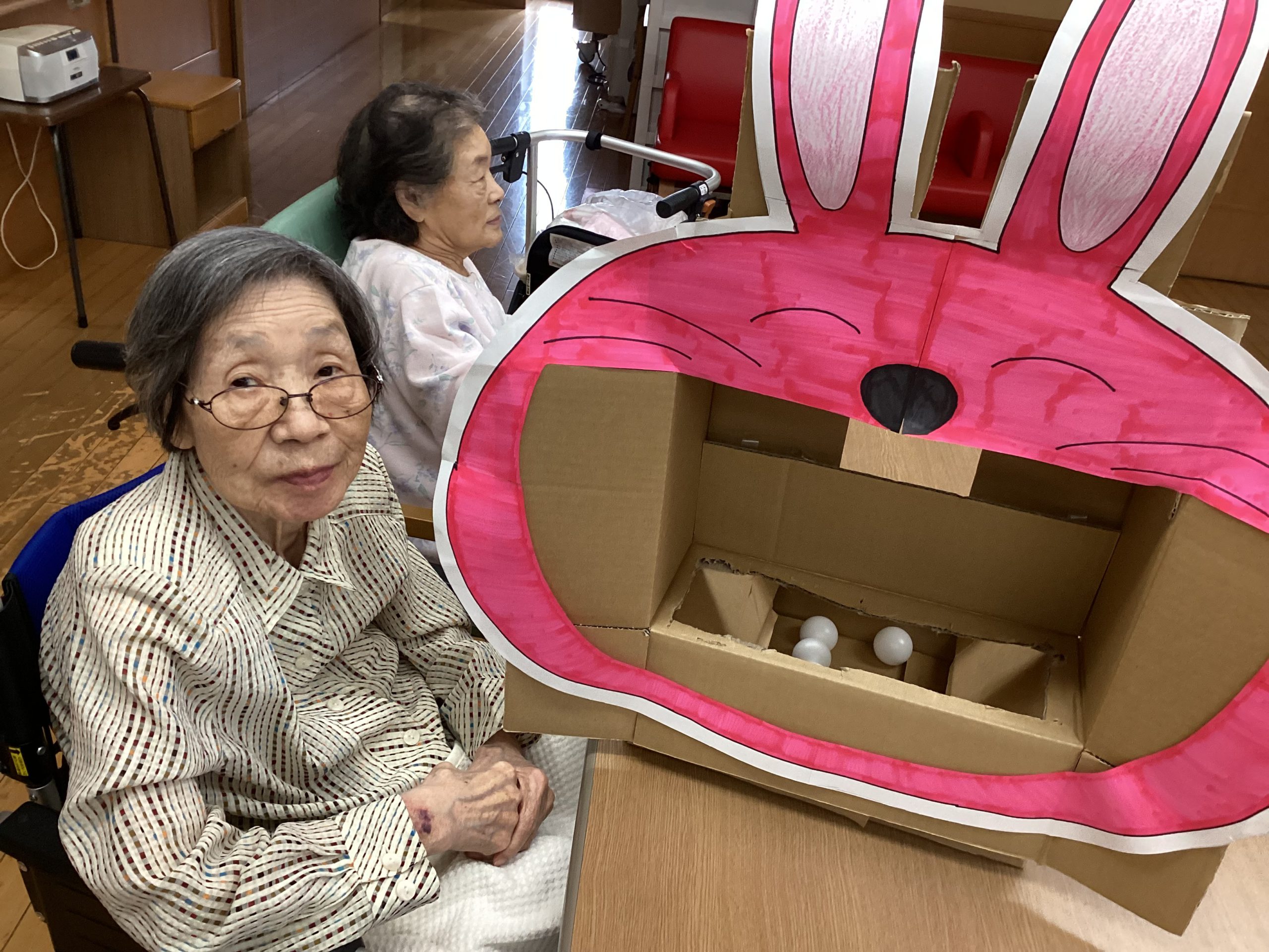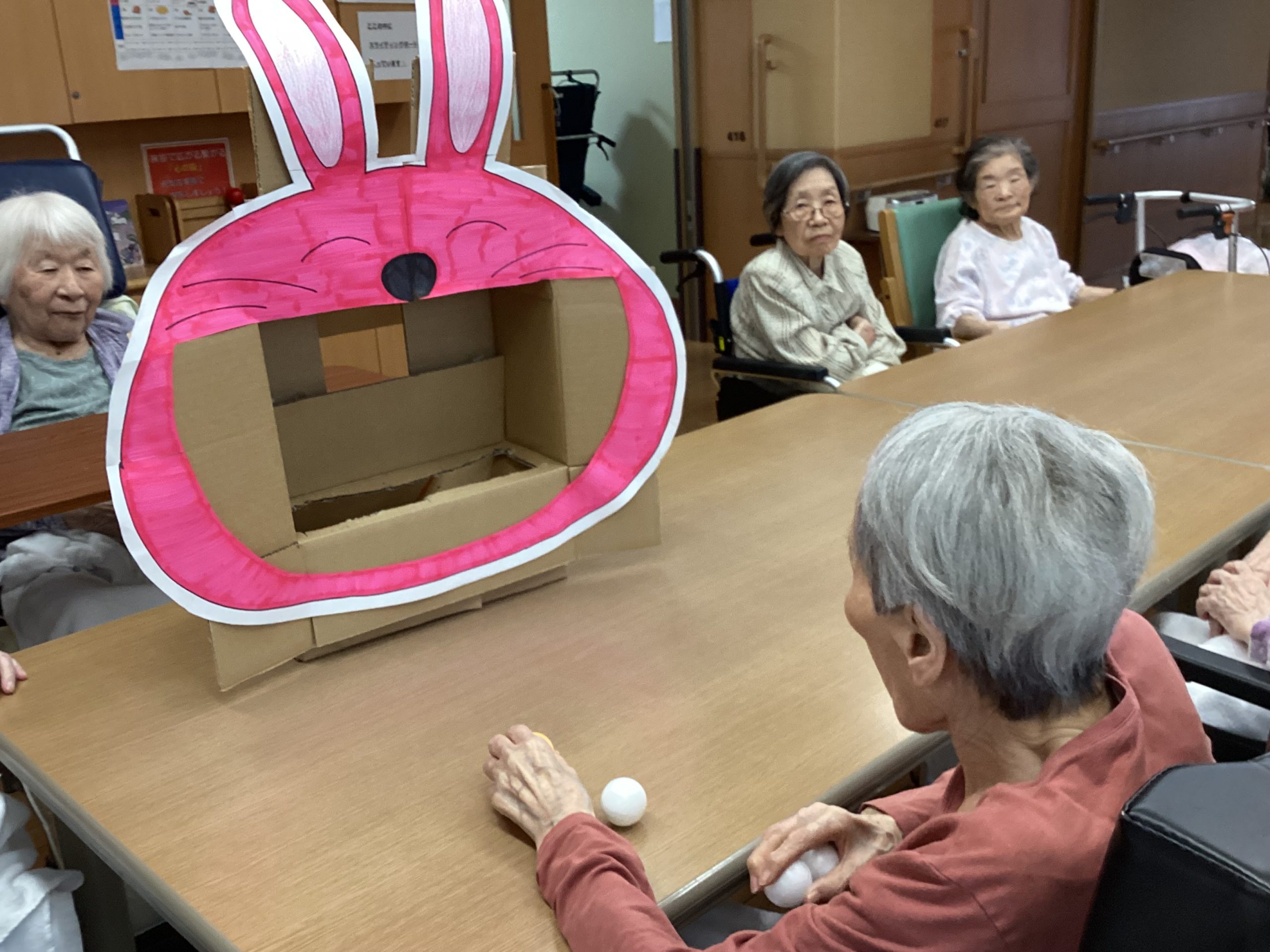 ピンポン玉をお餅に見立てて大きなうさぎさんのお口に投げて頂きました😄