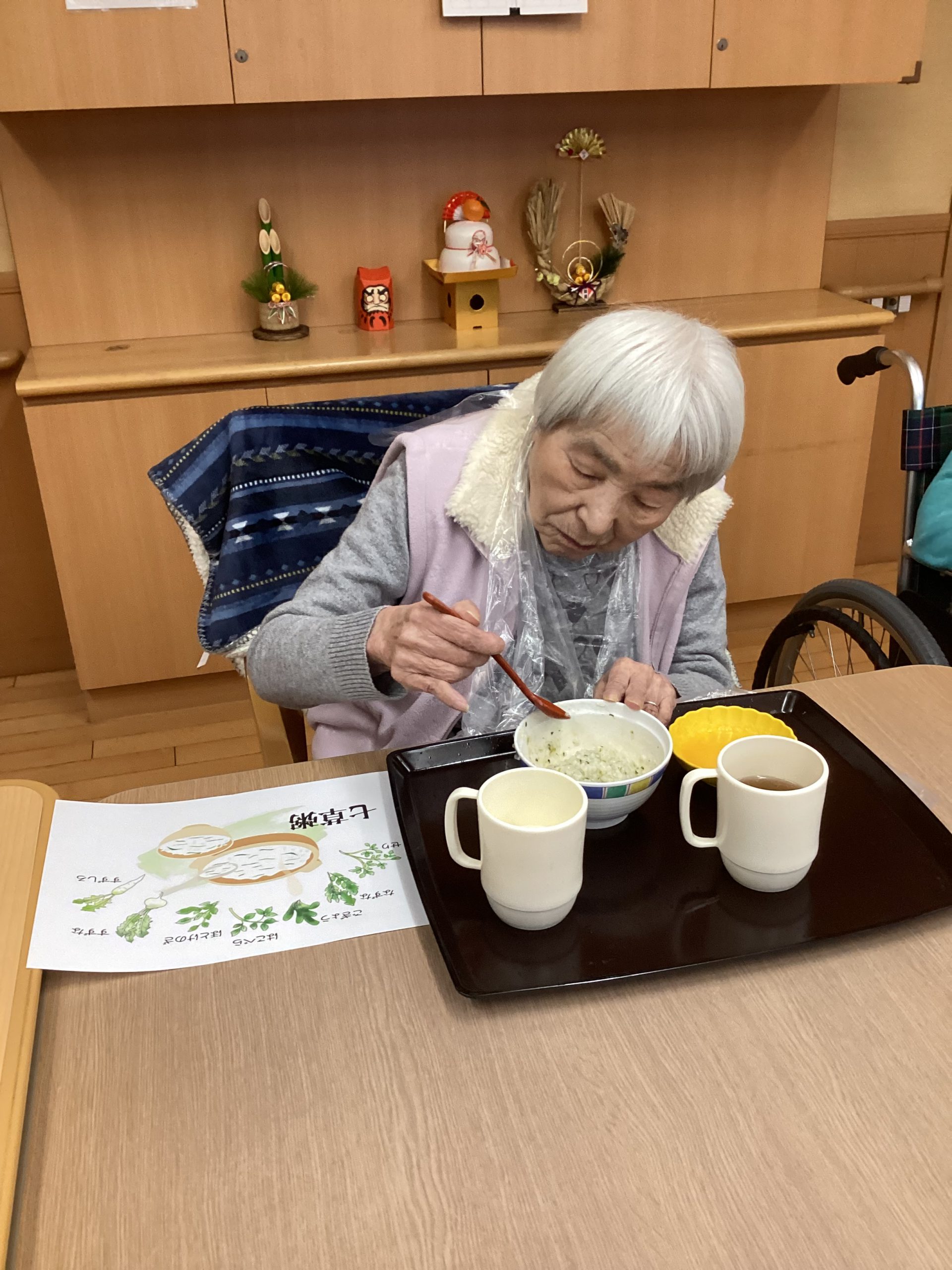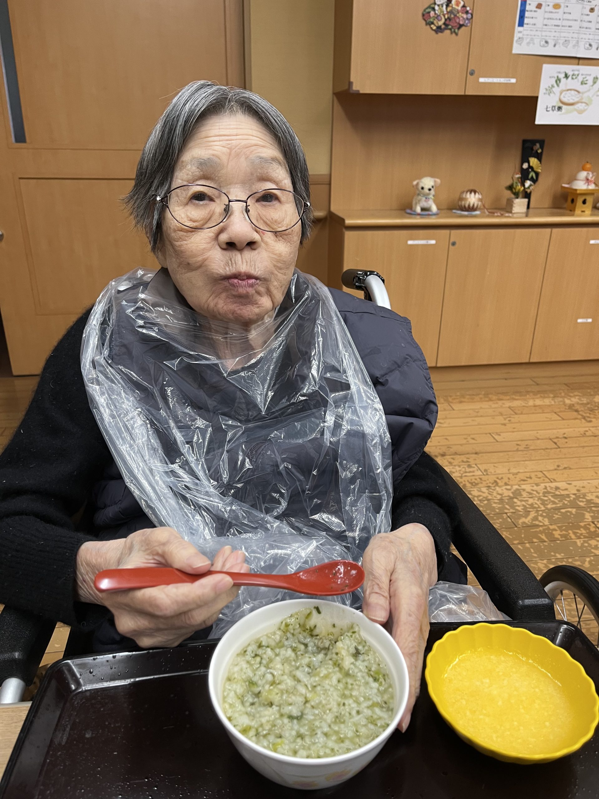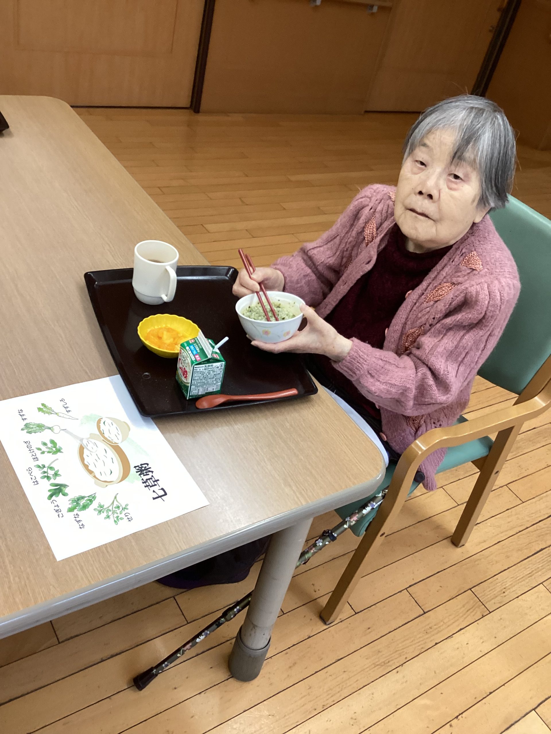 今回は、ご利用者様に七草粥を召し上がっていただいた様子を