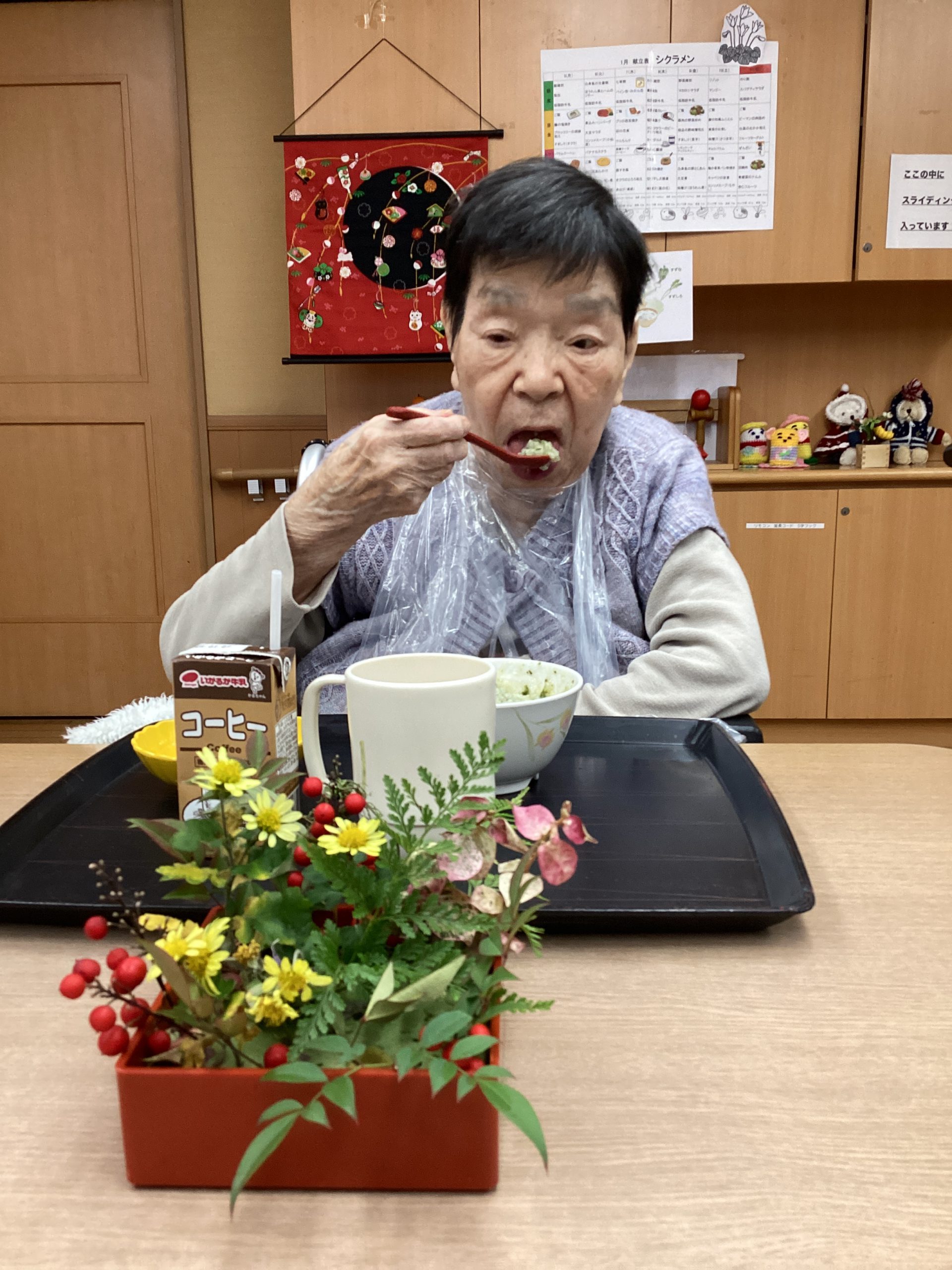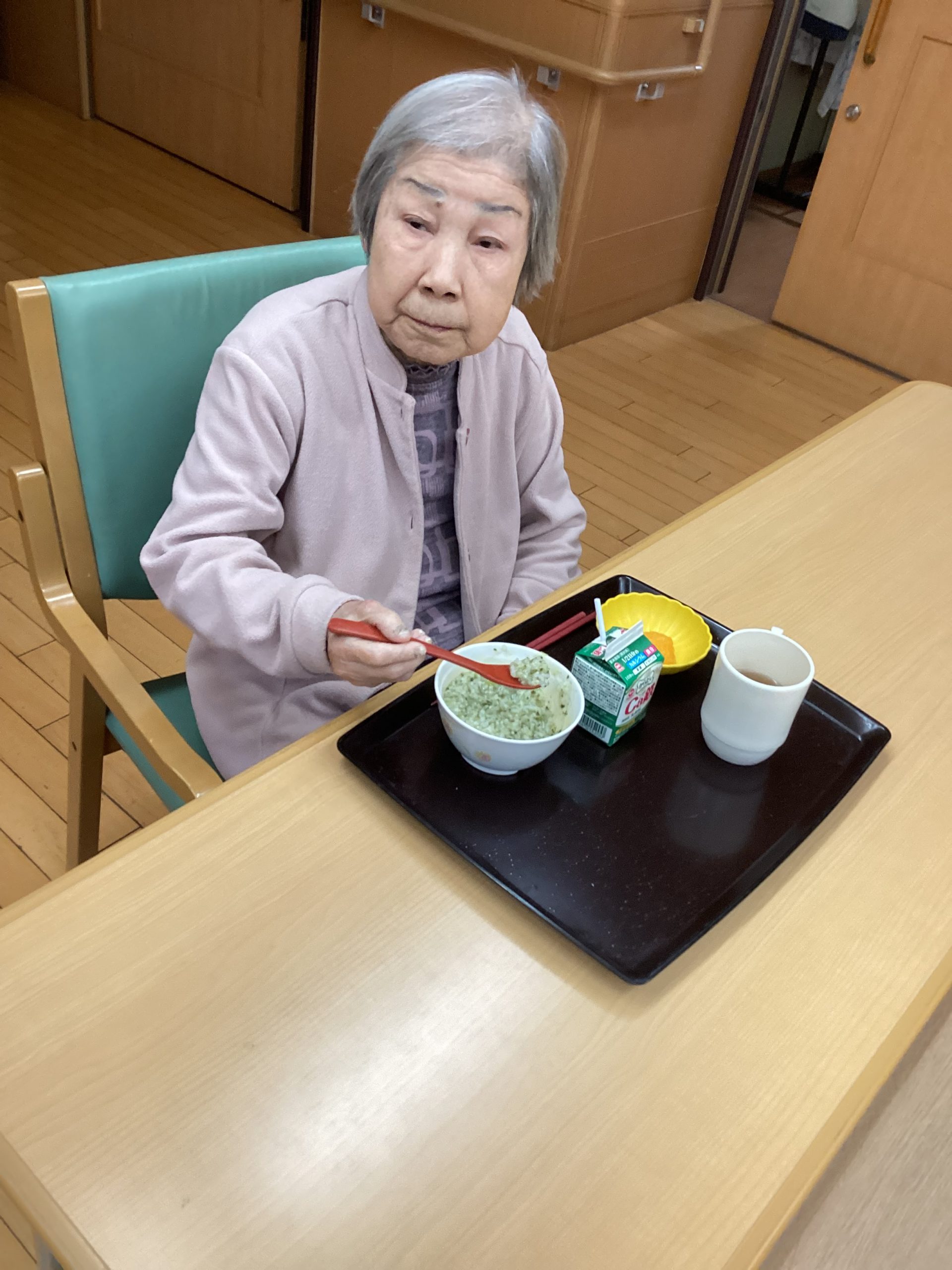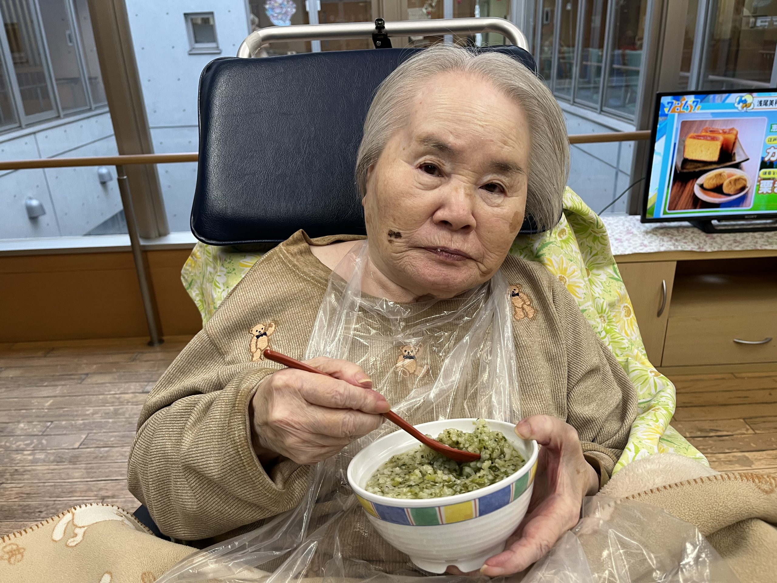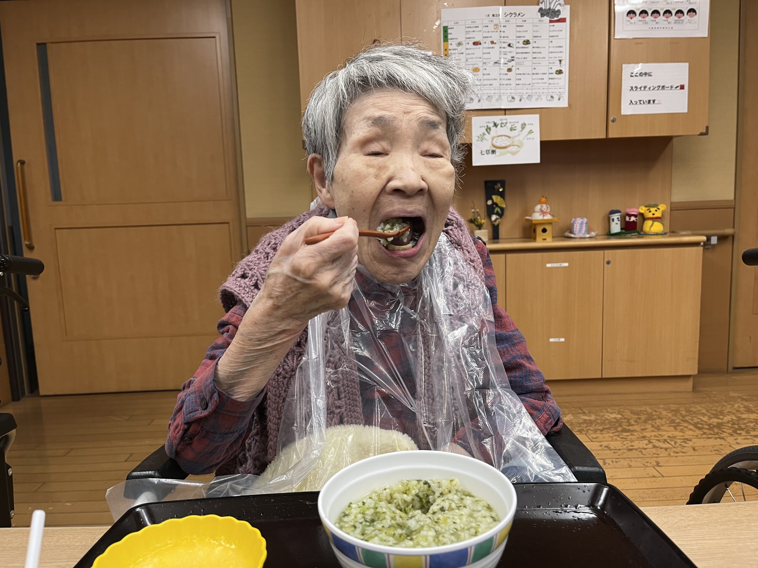 今回は、ご利用者様に七草粥を召し上がっていただいた様子を