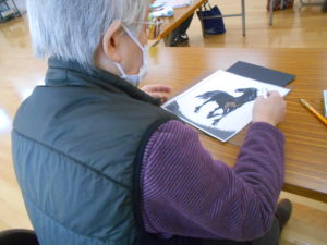 当日は以前に講師をしていただいていた森川先生が来年の干支である「午」の原画をお持ちくださり、参加者の皆様にプレゼントしてくださいました。また完成した作品には、もっと良くなるためのアドバイスもしてくださり、皆様アドバイスを真剣に聞いておられました。