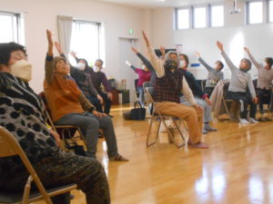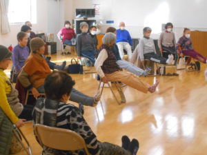 また最後には12月といえばクリスマスという事で「ジングルベル」に合わせた両手両足を中心に大きく身体を動かす体操をしました。音楽を聴く、体を動かすという2つの事を一度に行うことで色々な刺激を受けることが出来ました。