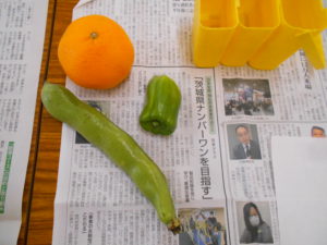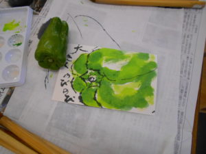練習の後は、先生が用意してくださったモチーフの中から好きなものを選び、作品づくりに取り組みました。ピーマンやデコポン、そら豆など、春らしい瑞々しい題材が並びます。