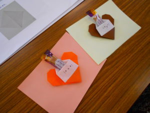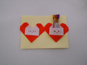 今回は、折り紙作品を紹介しているサイト「おりがみの時間」の作品を参考に、“ハートねこポケット”の折り紙制作を行いました。