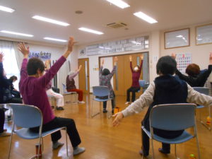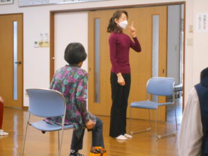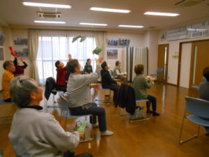 最後は音楽に合わせて体を動かしました。今回の楽曲は「ソーラン節」。皆さま「はい、はい」「どっこいしょー」「やーーー」と元気に声を出しながら、笑顔で踊っておられました。声を出すことは横隔膜をしっかり動かし、呼吸を深めることにつながります。呼吸が整うことでリラックス効果も期待でき、心身ともにすっきりとした時間となりました。
