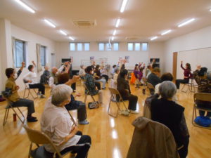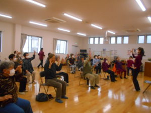 今日もいつものように、頭と体をほぐす「指運動」からスタートしました。手と足で違う動きをしたり、両手で異なる動きを行ったりと、少し頭を使う内容でしたが、皆さま笑顔で取り組まれていました。「あれ?思ったように動かない」と笑い合いながら、和やかな雰囲気で進みました。