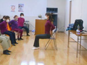 講師は、いつも楽しく体操される健康運動実践指導者の前田真理子先生です。前田先生は身体を動かすときの姿勢の大切さや、運動をする際の注意点などわかりやすく解説してくださいます。