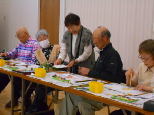 絵手紙とは、ハガキに身近なモチーフの絵と短い言葉を添え、相手への気持ちを伝える手紙です。絵の上手さよりも気持ちを伝えることを大切にしており、「ヘタでいい ヘタがいい」という言葉がモットーとなっています。今回も講師には、東大阪市で活動されている絵手紙彩の代表・永重信江先生をお迎えしました。