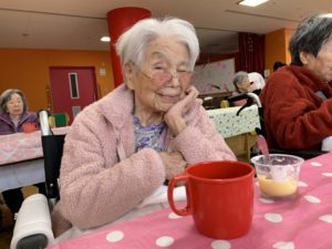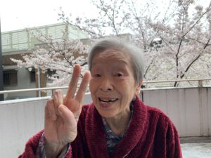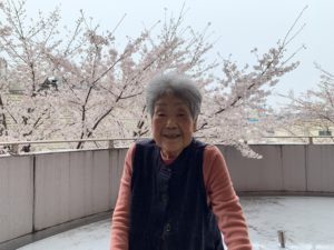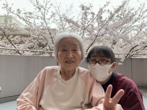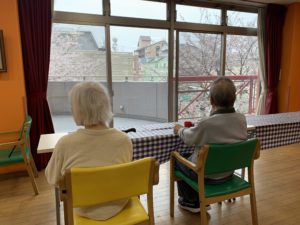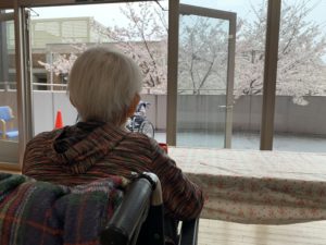 施設2階のベランダからは立派な桜の木が見えるため、桜を見ながらコーヒーやおやつを召し上がっていただきました。当日はあいにくの天気となりましたが、お花見を開始すると雨が徐々に小降りになり、近くで桜を見ることができました。
