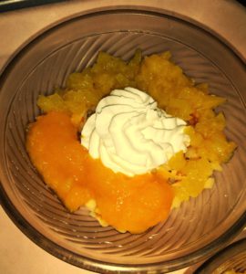 牛乳と卵をいれて混ぜて焼き、果物の缶詰や生クリームをトッピングしました🥚